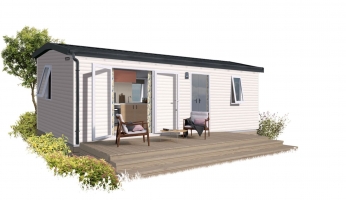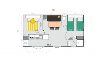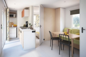 A sala de estar é um espaço dedicado à habitação familiar no centro da casa móvel, o que permite a separação dos dois quartos.