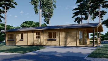 A casa modelo AVON tem um alpendre de 11,5 m²: o local ideal para aproveitar o sol da manhã e a companhia de outras pessoas. Um espaço de 27 m² que lhe dá total liberdade para criar uma bela cozinha, sala de jantar e áreas de estar. 2 quartos confortáveis que oferecem espaço mais do que suficiente para criar uma zona privada onde pode desfrutar de um sono tranquilo. Uma disposição interna prática com várias salas maiores e menores que permitem aproveitar ao máximo todo o espaço. Um elegante telhado de duas águas com uma saliência, um maravilhoso elemento de estilo clássico que lhe confere uma aparência tradicional e aconchegante e oferece uma área de sombra no exterior. Zona de banho e sanitários separados. A nossa casa de madeira: AVON, com o seu design clássico, belo terraço e design de interiores prático, pode tornar-se o lugar perfeito onde pode desfrutar de um estilo de vida mais descontraído e mais perto da natureza.