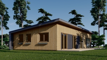 A casa modelo ZOE tem uma magnífica disposição interior: 3 quartos amplos, uma ampla sala de estar de 35 m² e três casas de banho separados que garantem o máximo conforto residencial. Revestimento vertical contemporâneo, proporcionando um visual moderno e requintado. Telhado inclinado contemporâneo e elegante que chama a atenção instantaneamente. Inúmeras janelas que oferecem espaços internos bem iluminados e acolhedores. Feito de madeira de coníferas natural de alta qualidade, garantindo um ambiente de vida saudável. Possibilidade de ampliação da casa com amplo terraço frontal e lateral (opcional). A nossa casa de madeira ZOE, com forma assimétrica elegante e design arquitetónico contemporâneo, pode se tornar uma luxuosa residência familiar ou casa de férias. Os 110 m² de superfície interior, aliados a um enorme terraço, fazem deste modelo uma opção excecional para casas maiores que pretendem garantir privacidade e conforto a cada membro da família. Temos um modelo semelhante de casa de madeira com telhado de duas águas, caso queira explorar outra opção com as mesmas vantagens funcionais.